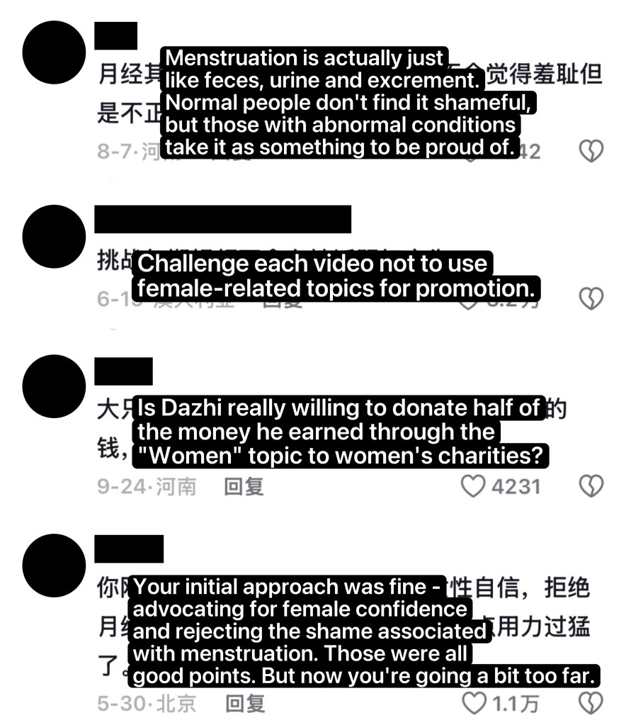 In the context of China, menstruation remains stigmatized. A majority of people use black shopping bags to hide menstrual pads when purchasing them; people of all genders habitually use the term “auntie”(大姨妈) to avoid directly saying “menstruation” – a word considered explicit. While Dazhi actively disrupts these norms: as shown in Figures 1&2, she hangs a sign saying, “I have pads, come and borrow them from me” and distributes free pads to every woman passing by; her white pants are visibly stained with menstrual blood, but she refuses to hide it and continues to film as if the leakage were normal. In a discourse that demands menstruation concealment, her videos embody a refusal to be a silent menstruator – making hyper-visible what is supposed to remain hidden. Furthermore, audience responses construct her as a “failure”. Figure 3 shows typical reactions: viewers label her actions as “abnormal”, “sensational”, and “exaggerated.” Since the majority uphold the traditional framework, these hostile reactions confirm that her practices have successfully disrupted cultural norms. In stage 2, Dazhi’s “failure” aesthetics functions to expose the internal contradictions of patriarchal logic. By making menstruation hyper-visible, her practices reveal a paradox: while the patriarchal discourse insists that women should be “charming”, “visible” and “available to the male gaze”, their physiological phenomenon – menstruation – is paradoxically required to be “invisible” and “embarrassing”. As Halberstam mentioned, failure practice recognises that alternatives are already embedded in the dominant and power is not consistent, therefore, “failure can exploit the unpredictability of ideology and its indeterminate qualities.”[5] Dazhi’s over-performance of menstrual visibility precisely targets this gap, the impossible demand that women be both seen as sexual objects and unseen as menstruating bodies. Nevertheless, the interpretation of her “failure” requires the theoretical lens I have applied. For the majority of her audience, her practices remain merely “disgusting” or “abnormal” videos, they fail to be decoded as political critique. In other words, while Dazhi obtains “failure” aspects (stage 1) and achieves aesthetic level (stage 2), she fails to reach stage 3 – the stage of social recognition and transformation – due to the enabling conditions for such recognition being absent.