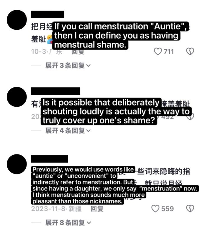 In stage 1, Dazhi’s practices can be read as “failure” on two levels: on the inside, her videos deliberately violate menstruation stigma; on the outside, these violations provoke aggressive responses that mark her as deviant. In stage 2, her over-performance of menstrual visibility captures the inconsistency within patriarchal discourse, turning “failure” into an oppositional tool.